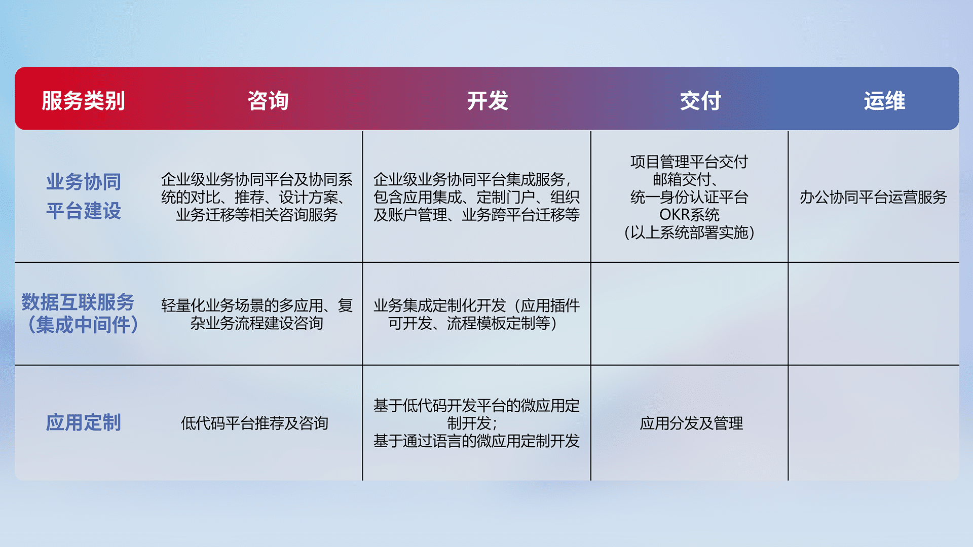 针对钉钉、、、、企微、、、IDaas等平台级产品提供产品的规划、、方案、、、、交付、、、定制化开发等服务,,,,实现如统一协同办公、、智能客户服务、、、、混合会议管理、、、智能数据查询、、等业务场景,,实现数字化转型。。